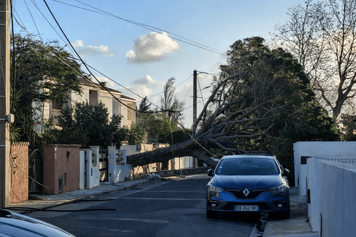 Arbre abattu par la tempête Nils à Salses-le-Château (66) ce jeudi 12 février 2026 - photo Jean-Sébastien Gantou