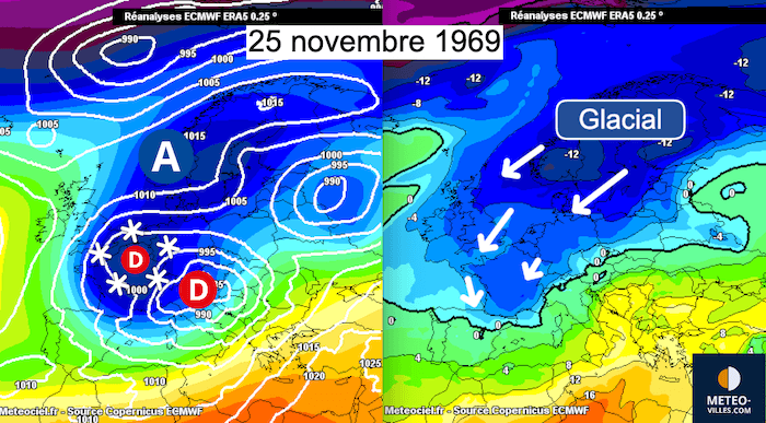 Le 25 novembre 1969, une masse d’air polaire maritime instable déboule depuis les Pays scandinaves, jusque sur la France,  entraînant des chutes de neige précoces et une désorganisation rapide des réseaux de transport. Les archives météorologiques décrivent une situation de « neige paralysante », conséquence d’un refroidissement brutal. En moins de 48 heures, une grande partie de la France se trouve plongée dans un véritable régime hivernal.