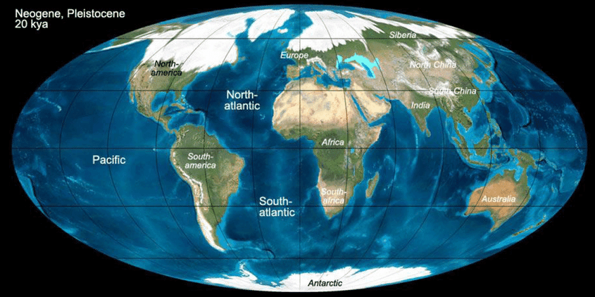 Lors des périodes de glaciation, c'est l'hémisphère nord de la planète qui se refroidit le plus nettement. L'explication est simple : la partie nord du globe terrestre comporte bien plus de terres que sa partie sud. Or, le froid s'accumule et s'accentue bien plus facilement au dessus des continents qu'au dessus des océans. Ainsi, lors de l'apogée du dernier âge glaciaire (il y a 21.000 ans), la glace recouvrait toute la partie nord de l'Europe ainsi que tout le Canada et le nord des États-Unis. Une partie de l'Amérique du Sud était également prise dans la glace.