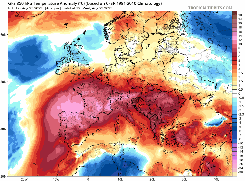 Anomalie thermique de la masse d'air du mercredi 23 au lundi 28 août 2023 - via tropicaltidbits.com