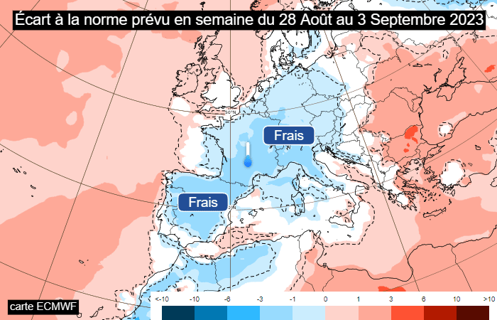 Écart à la normale prévu en semaine du lundi 28 août au dimanche 3 septembre 2023 - carte ECMWF