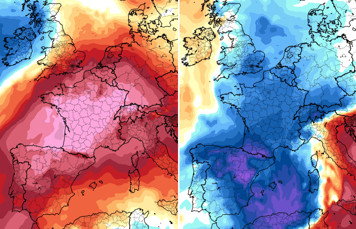 L'animation ci-dessous permet de visualiser l'ampleur de la baisse des températures qui nous attend. Nous sommes toujours sous l'effet d'un dôme de chaleur historique avec des températures en altitude qui sont jusqu'à 15°C supérieures à la normale dans le sud de la France ! Toutefois, la situation s'apprête à évoluer avec la bascule en flux de nord-ouest entre le vendredi 25 et le samedi 26 août 2023. Ainsi, une masse d'air océanique venue du nord de l'Atlantique s'enfoncera sur la France en chassant l'air chaud. Ce week-end, les températures de la masse d'air seront souvent 3 à 6°C sous les normales, perdant parfois une vingtaine de degrés en 48 heures !