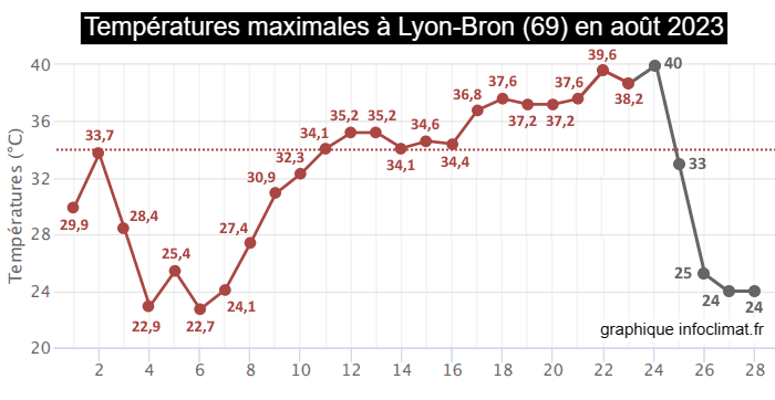 Températures maximales relevées et prévues à Lyon en août 2023 - graphique infoclimat.fr