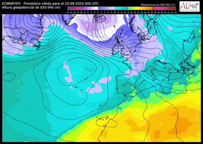 Température de la masse d'air vers 1500m du 10 au 15 septembre 2024 - AEMet