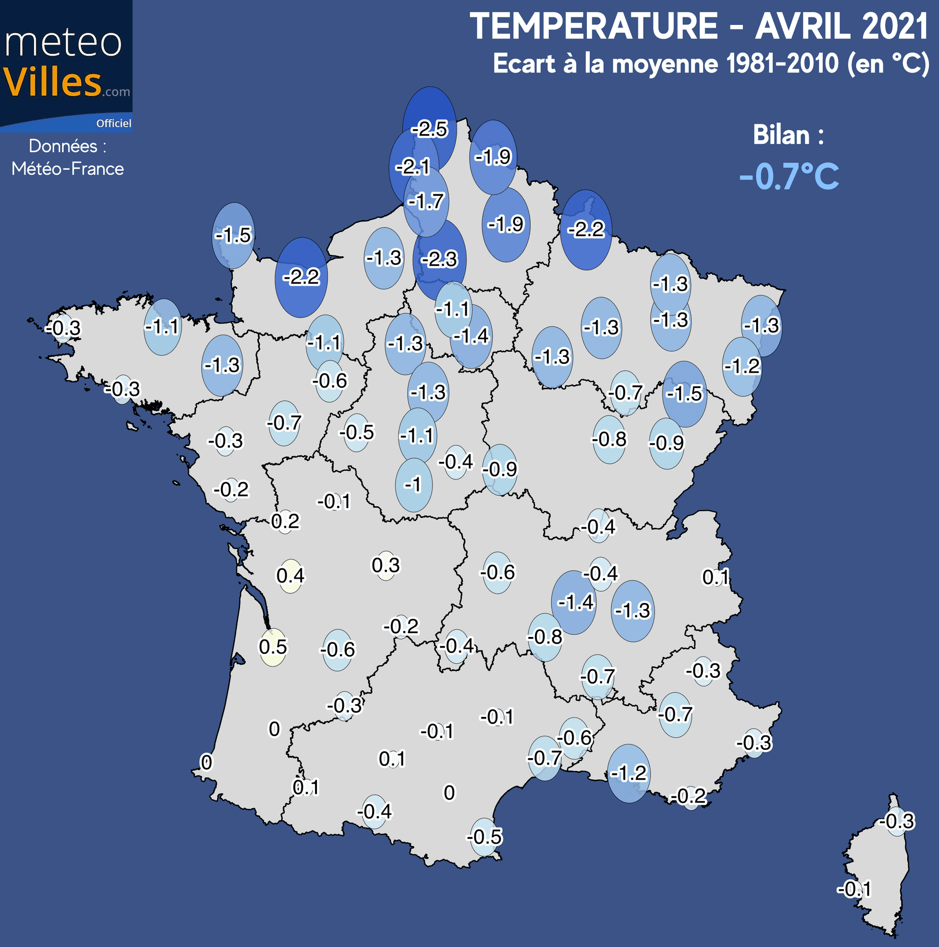 Comme démontré dans le bilan du mois d’avril 2021, la fraîcheur a dominé sur la totalité de la France avec une température moyenne mensuelle inférieure de 0.7°C aux normales de la période 1981-2010. Cette anomalie atteint même -1.2°C en prenant en compte les normales 1991/2020, entrant bientôt en vigueur.