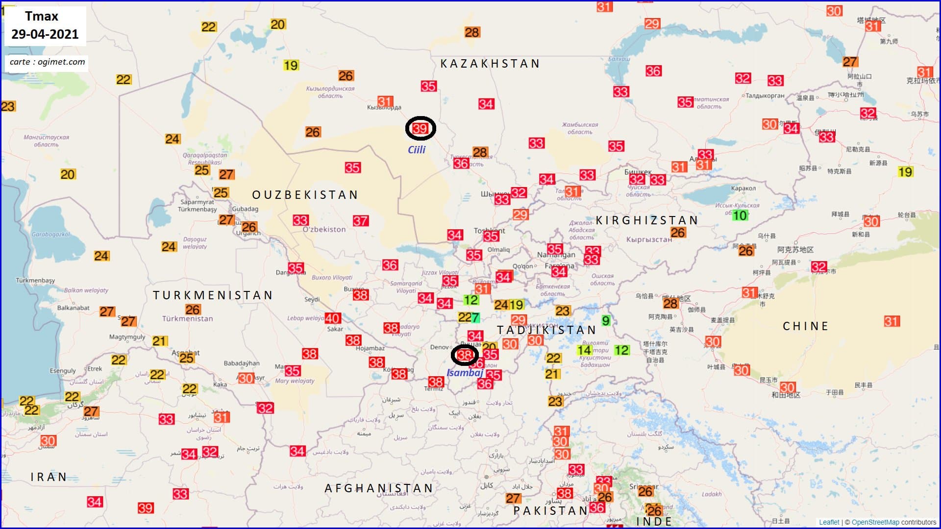 Températures maximales et records de chaleur sur l’Asie-Centrale le 29 avril dernier – Via twitter @EKmeteo