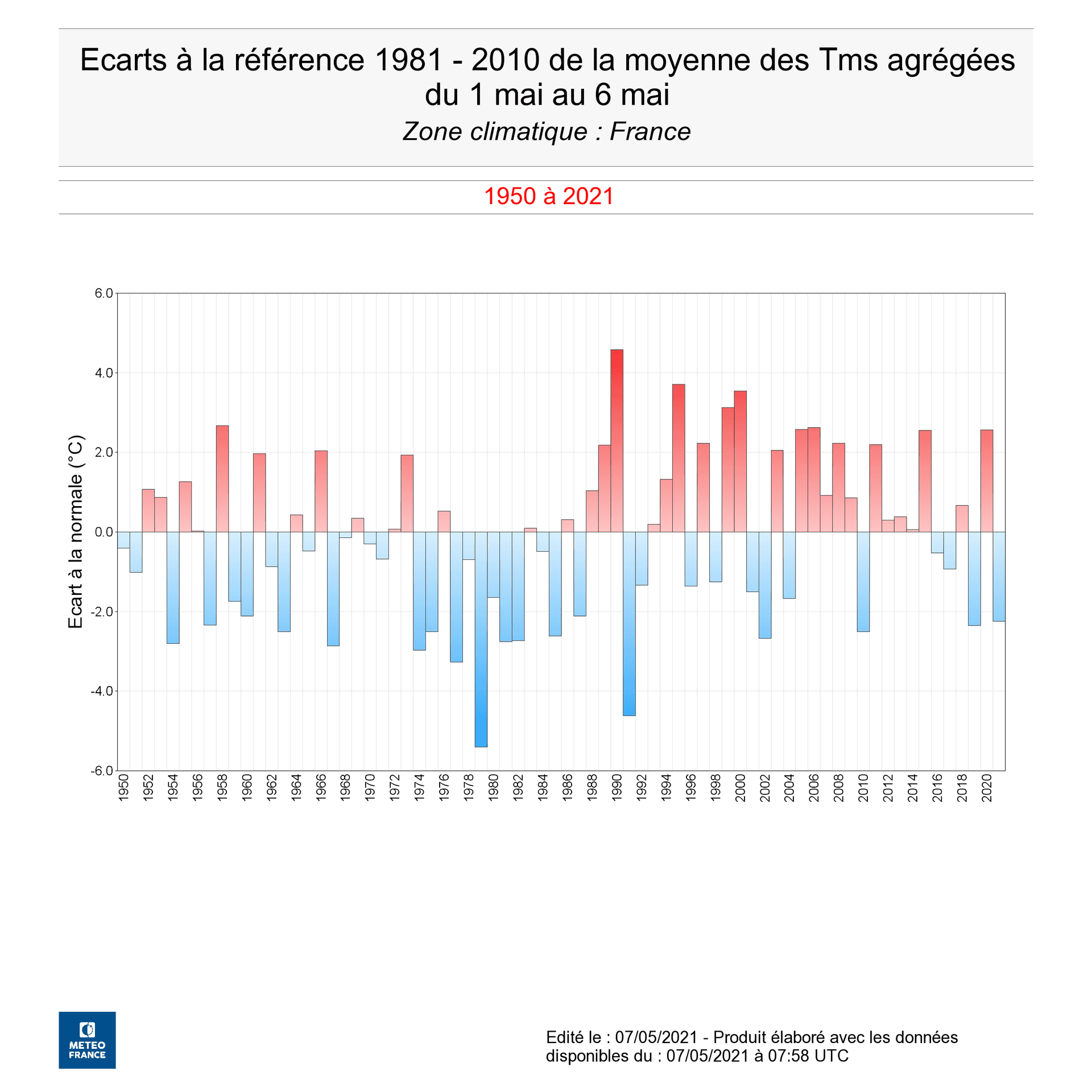 Anomalies de températures durant les 6 premiers jours de mai depuis 1950 sur la France – Météo-France