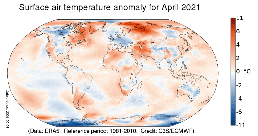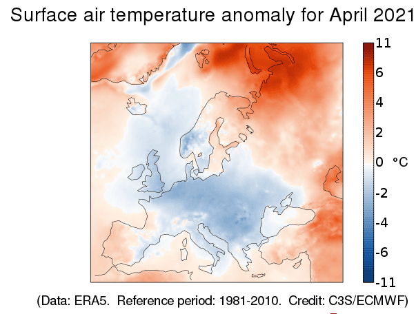Anomalies thermiques sur l’Europe et le Monde durant le mois d’avril 2021 – Copernicus