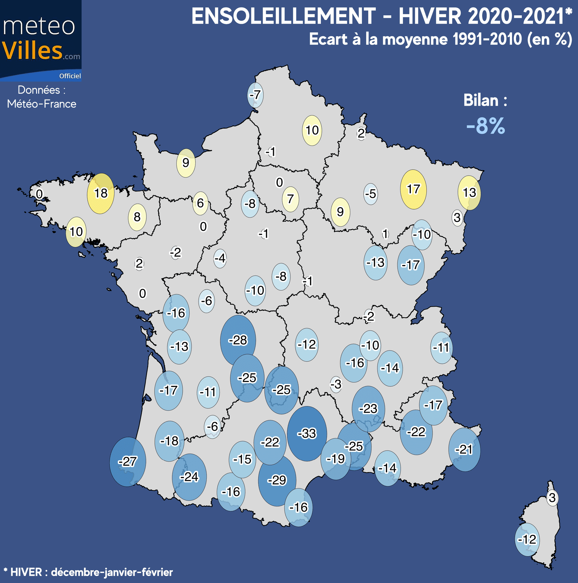 Qui dit plus humide que la normale, dit généralement soleil peu présent. Ceci est encore démontré pour cet hiver 2020-2021 avec des conditions assez dépressionnaires durant les deux premiers mois de la saison ayant fortement limité l'ensoleillement. La période plus anticyclonique et lumineuse de la seconde partie de février n'a pas été suffisante pour compenser ce déficit... Sur notre panel de station, le déficit national a donc atteint -8% sur l'ensemble de cet hiver 2020-2021.