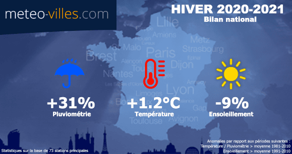 L’hiver 2020-2021 se termine et si certains auront retenu la vague de froid de février sur la moitié Nord, c'est plutôt la douceur ainsi que la pluie qui auront été dominants... Place donc au bilan climatique cartographié de cet HIVER METEOROLOGIQUE 2020-2021 (décembre-janvier-février) en termes de température, pluviométrie et ensoleillement sur un panel de 73 stations*.