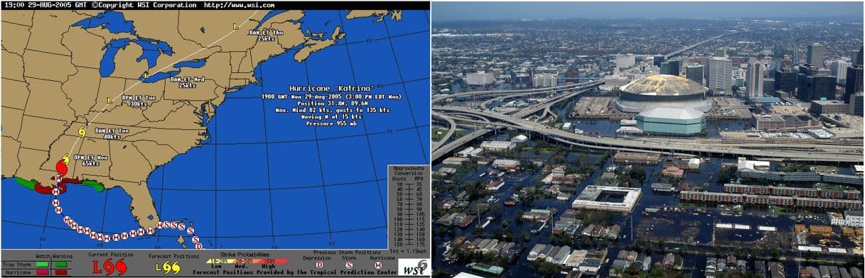 A gauche : Trajectoire de Katrina - WST - A droite : Photo aérienne de La Nouvelle-Orléans - Jeremy L. Grisham - US Navy