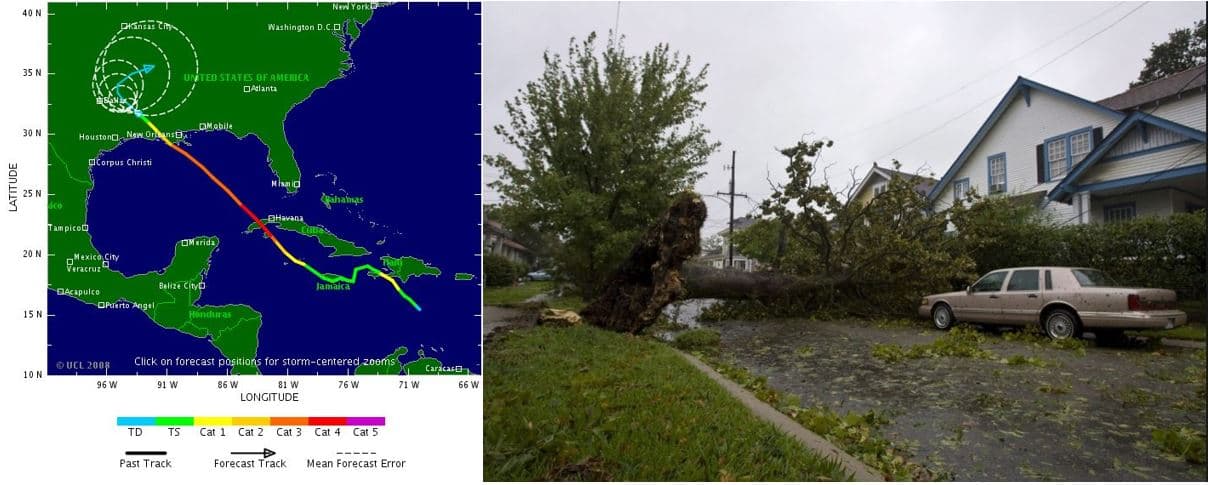 A gauche : Trajectoire de Gustav - Tropical Storm Risk - A droite : Photo de dégâts en Louisiane - RTBF