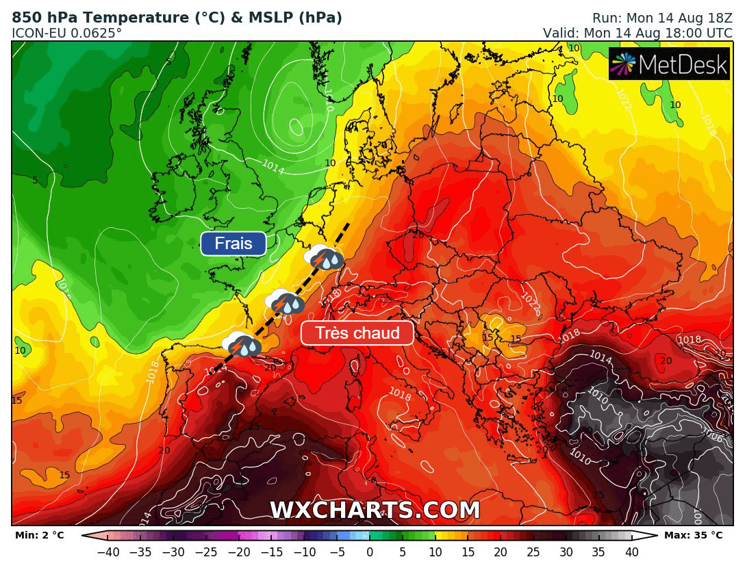 Masses d'air vers 1500m ce lundi 14 août 2023 - via wxcharts.com