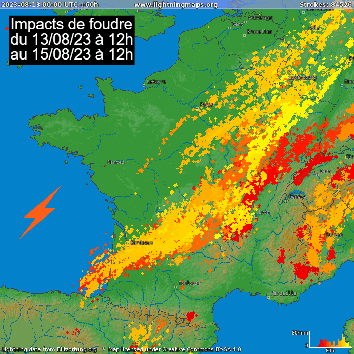 Éclairs sur 48h entre le dimanche 13 août à midi et le lundi 15 août 2023 à midi - carte lightningmaps.org
