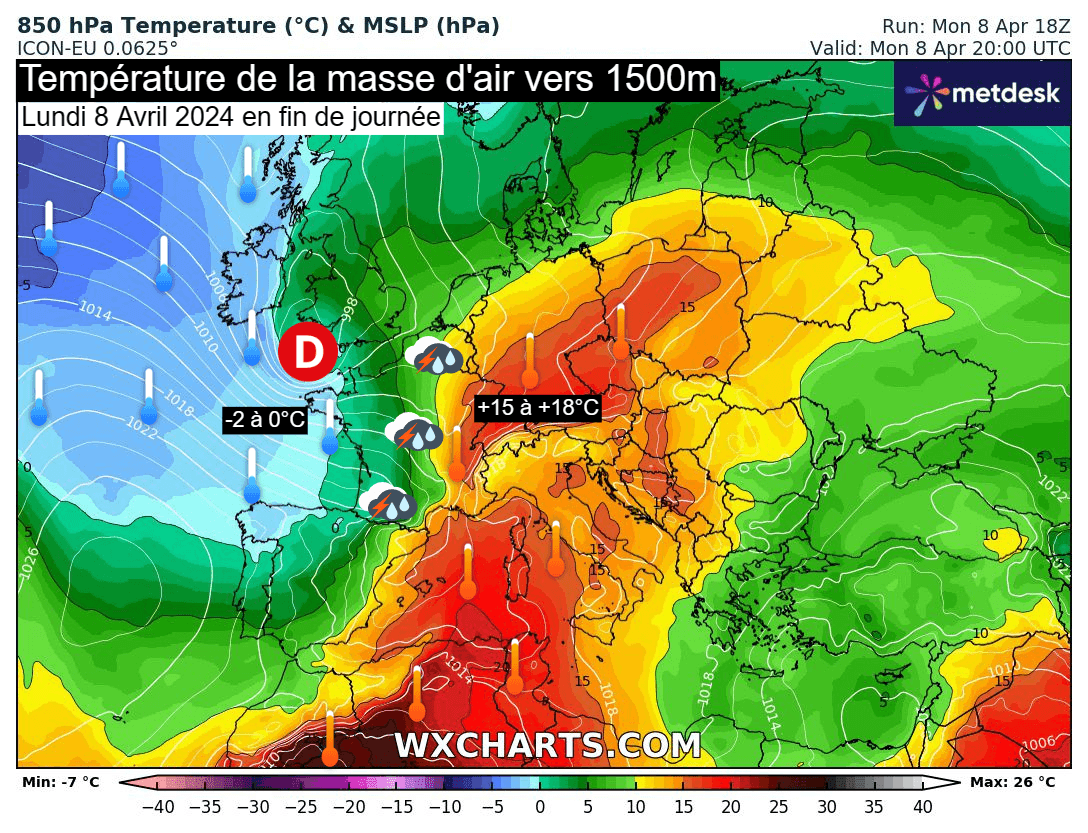 Température de la masse d'air vers 1500m ce lundi 8 avril 2024 - via wxcharts.com