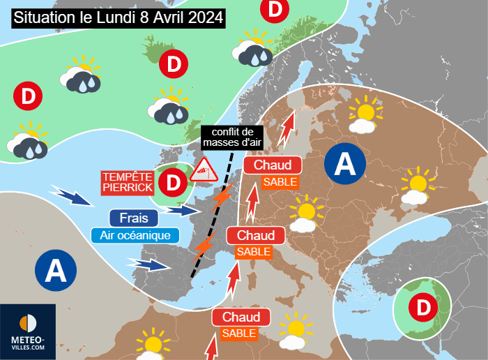 Avec un anticyclone se décalant sur l'Europe Centrale, un flux de sud vecteur d'air chaud en provenance d'Afrique concernait encore la France ce lundi 8 avril 2024. L'origine du flux est confirmée par la présence de poussières de sable du Sahara, encore nombreuses dans le ciel du sud et de l'est de l'hexagone ce lundi. Dans le même temps, les basses pressions atlantiques s'affirmaient avec le creusement de la tempête Pierrick entre la Bretagne et l'Irlande. Celle-ci engendrait la bascule du flux au secteur ouest sur les régions océaniques, amenant un air nettement plus frais. C'est donc un impressionnant choc de masses d'air qui s'est produit sur la France.