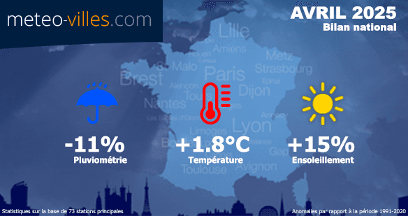 Comme à chaque début de mois, nous vous proposons un nouveau bilan climatologique. Place désormais au bilan cartographié d' AVRIL 2025 en termes de température, pluviométrie et ensoleillement sur un panel de 73 stations*. Les anomalies présentées sont calculées à partir des moyennes climatiques de la période de référence 1991-2020 sur l'ensemble des stations du panel.