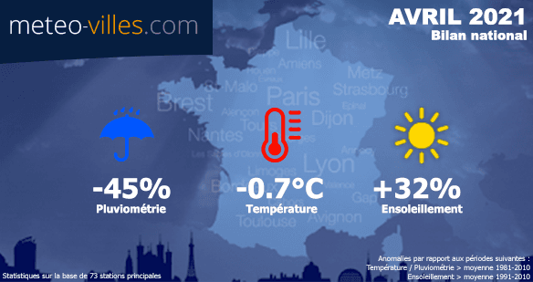 Comme à chaque début de mois, nous vous proposons un bilan climatologique du mois écoulé. Place donc au bilan cartographié du mois d'AVRIL 2021 en termes de température, pluviométrie et ensoleillement sur un panel de 73 stations*.