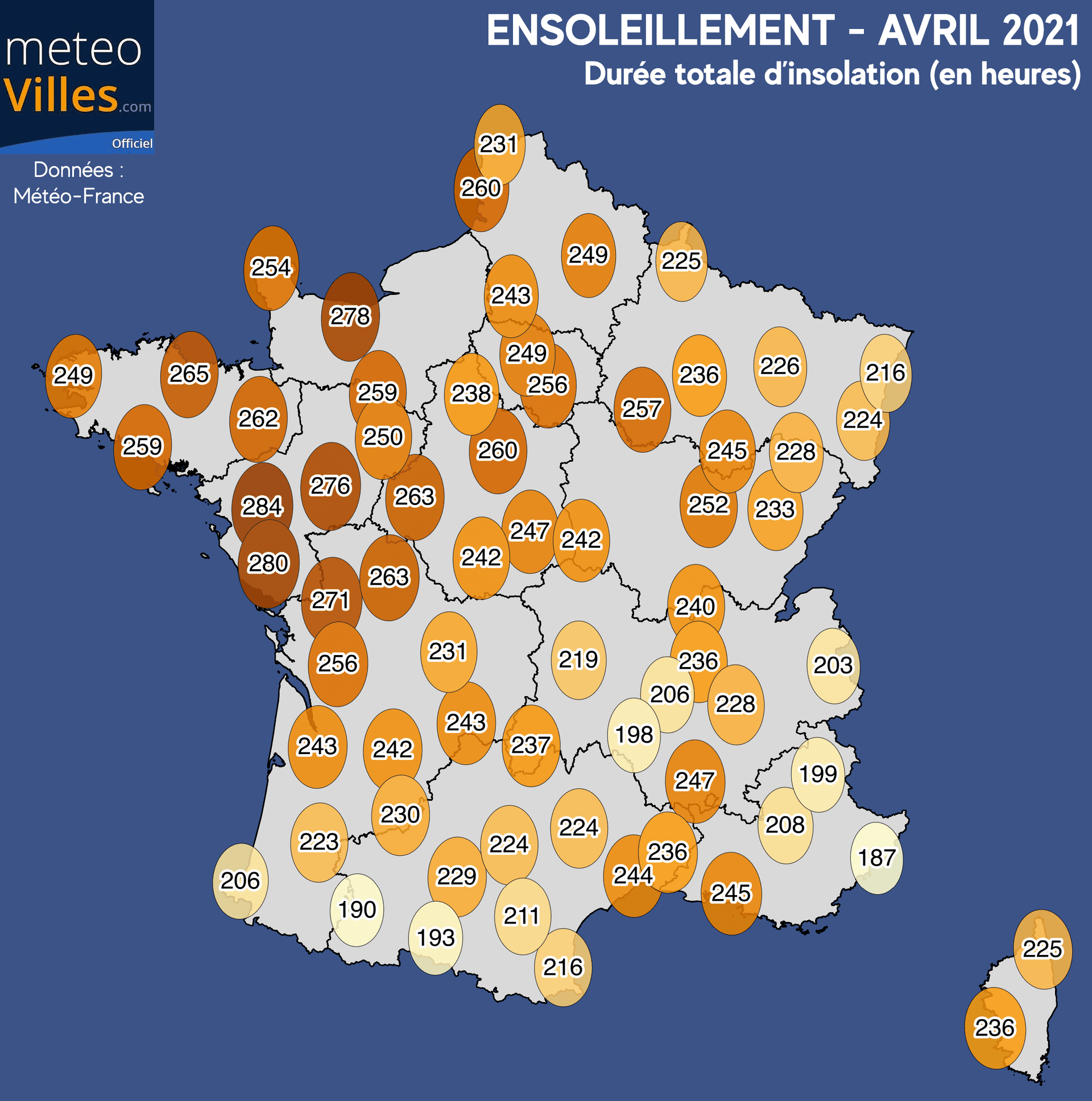 Avec un tel excédent global combiné à une certaine "grisaille" près de la grande bleue, le pourtour Méditerranéen ne pouvait pas se targuer d'être le lieu le plus ensoleillé de France au cours de ce mois d'avril, bien au contraire. Une situation assez rare pour être signalée : la ville la plus ensoleillée de France au mois d'avril se situe en Bretagne (296 heures) tandis que la moins ensoleillée situe tout simplement sur la Côte d'Azur, à Nice (187 heures) !