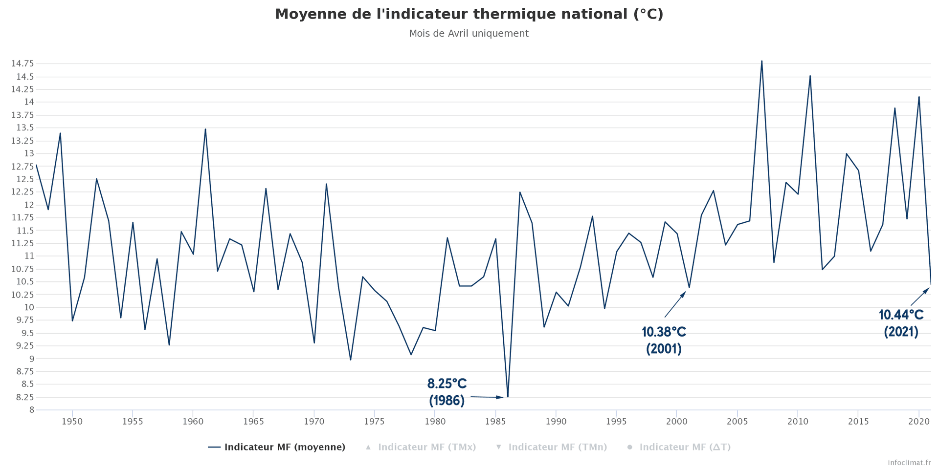 En effet, avec une anomalie de -1.6°C, les températures minimales de ce mois d'avril 2021 ont été les plus basses depuis 35 ans (avril 1986, considéré par ailleurs comme le mois d'avril le plus froid depuis l'après-guerre) en raison d'un flux continental sensible et permettant un dégagement du ciel la nuit (phénomène dit de "rayonnement nocturne"). Ceci s'est matérialisé par des gelées très fréquentes en de nombreuses régions du territoire, souvent plus d'un jour sur trois sur la moitié Nord.