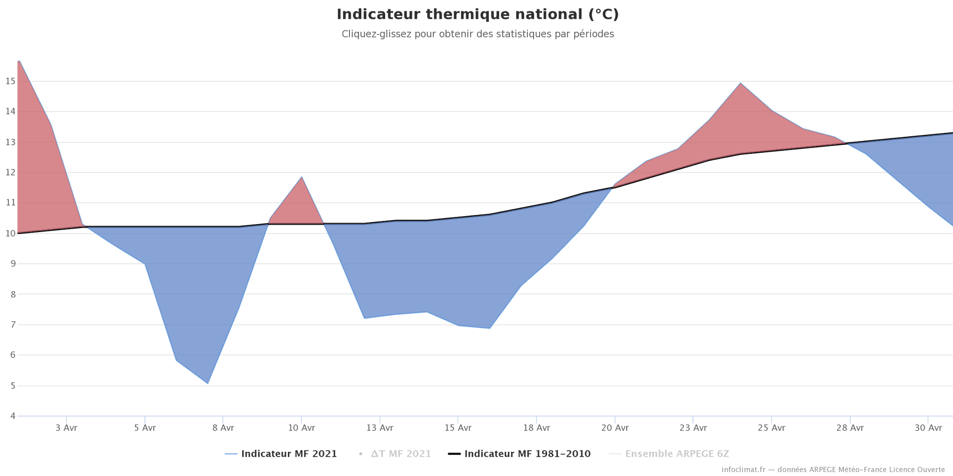 Nous l'avons tous remarqué, ce mois d'avril a été relativement frais, sur l'ensemble du pays, et rares ont été les jours réellement printaniers (tout début du mois, et début de 2e décade). Les températures ont en effet été sous les moyennes de saison puisque le bilan à l'échelle nationale est de -0.7°C par rapport à la moyenne 1981-2010 (température de 10.44°C). Vis-à-vis des normes 1991-2020 bientôt en vigueur, ce déficit thermique atteint même -1.2°C (données Infoclimat).