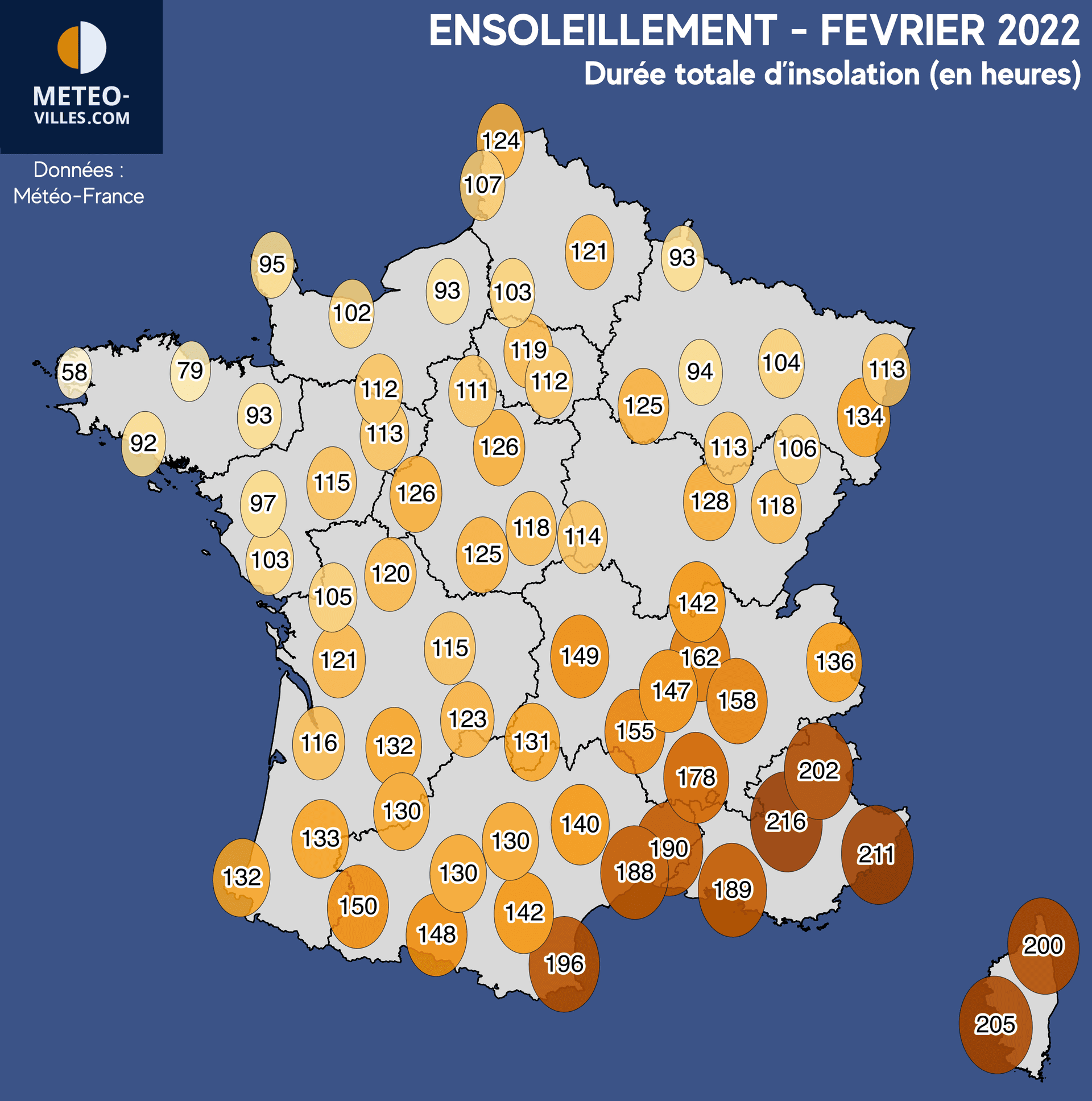 Comme à chaque début de mois, nous vous proposons un bilan climatologique du mois écoulé. Place donc au bilan cartographié du mois de FÉVRIER 2022 en termes de température, pluviométrie et ensoleillement sur un panel de 73 stations*.