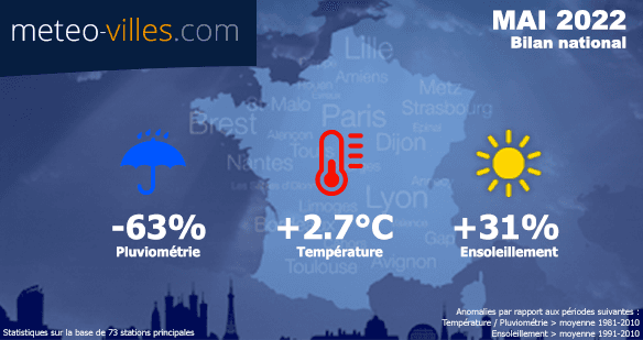 Comme à chaque début de mois, nous vous proposons un bilan climatologique du mois écoulé. Place donc au bilan cartographié du mois de MAI 2022 en termes de température, pluviométrie et ensoleillement sur un panel de 73 stations*.