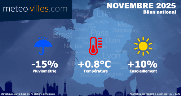 Partout ailleurs, ce mois de novembre a été plus sec qu'à l'accoutumée. C'est le cas sur toutes les villes allant de la Bretagne au Grand-Est en passant par le bassin Parisien (-33% à Paris, -44% à Nantes, -57% à Metz). Le quart Sud-Est (en dehors des Cévennes) n'a eu que peu de pluie durant ce mois, avec un déficit souvent compris entre -40 et 70% selon les villes du panel (-65% à Marseille-Marignane, -66% à Nîmes). Ce déficit atteint même -76% à Avignon et Cannes, ou encore -83% à Ristolas (Hautes-Alpes).