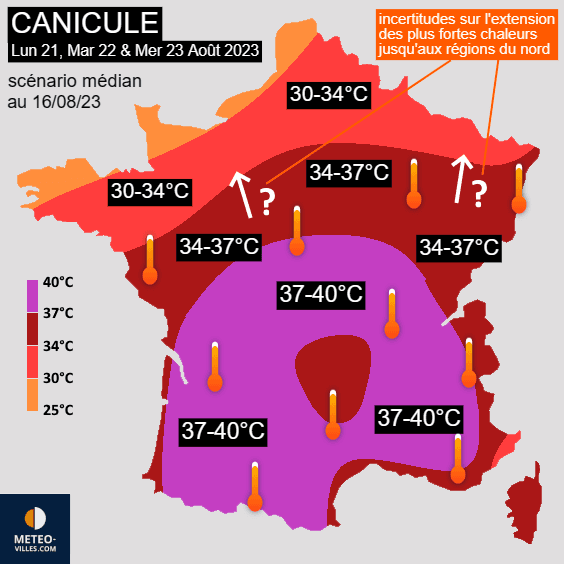 Ainsi, les journées du lundi 21, du mardi 22 et du mercredi 23 août 2023 s'annoncent excessivement chaudes sur une grande partie de la France. À ce jour, la plupart des modèles envisagent des températures maximales de 37 à 40°C sur le sud et le centre de la France et de 34 à 37°C des Pays de la Loire jusqu'en Alsace. Il s'agit du scénario médian car certains scénarios envisagent des pointes jusque 42-43°C ! Les différents modèles divergent quant à l'extension des plus fortes chaleurs jusqu'aux régions septentrionales. Il semble que les secteurs bordant la Manche puissent conserver une chaleur plus respirable mais cela demande confirmation...