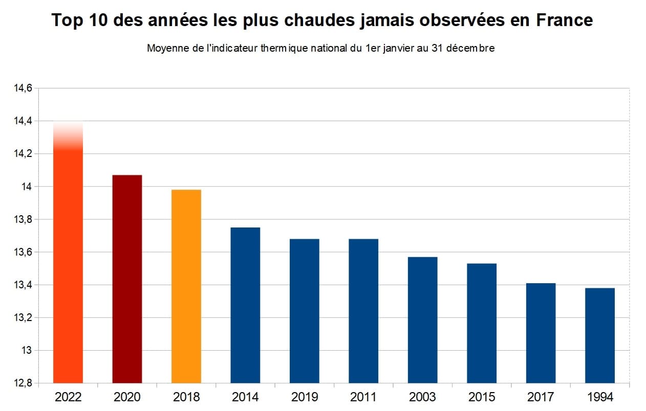 Pour rappel, les 5 années les plus chaudes jamais enregistrées sur notre pays se sont toutes produites entre 2014 et 2022 et 9 des 10 années les plus chaudes entre 2003 et 2022.