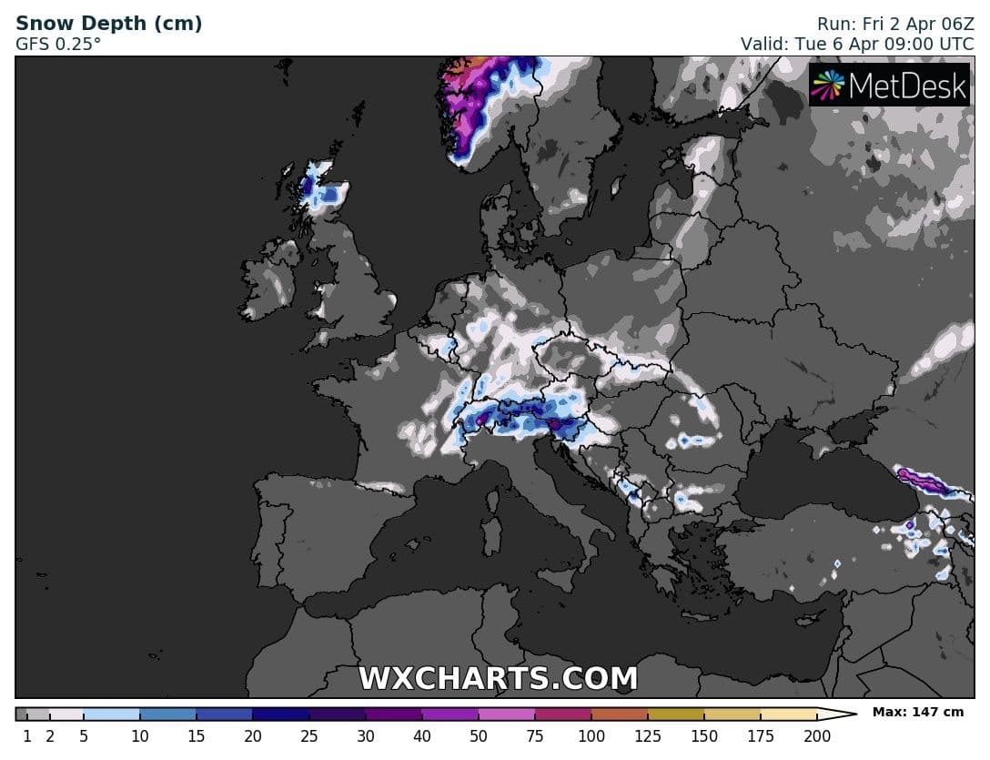 Couche de neige au sol envisagée pour le mardi 6 avril sur l’Ouest de l’Europe – Modèle GFS via WX CHARTS