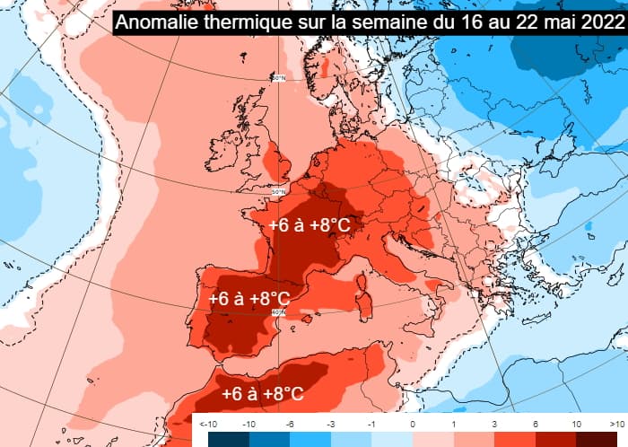 La carte ci-dessous illustre parfaitement l'ampleur de l'anomalie chaude des prochains jours. Cette semaine du 16 au 22 mai 2022 s'annonce comme l'une des plus anormalement chaudes en France depuis le début des relevés. L'anomalie moyennée sur 7 jours devrait atteindre +6 à +8°C sur les deux tiers de l'hexagone, des niveaux remarquables et justifiant que certains records puissent être menacés.