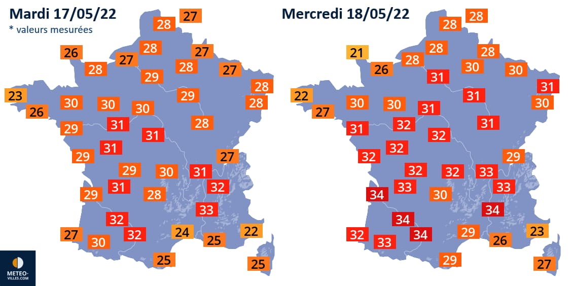 La chaleur s'est généralisée ce 17 mai et les 30°C ont été atteints jusque dans le bassin rennais ! Il a fait 32°C à Toulouse et près de 33°C à Montélimar. La chaleur va encore s'accentuer d'un cran ce mercredi 18 mai 2022. La barre des 30°C sera atteinte jusque dans le nord-est de la France et il pourrait faire 31°C dans Paris. On prévoit autour de 32°C dans le Poitou, 33°C dans le Lyonnais et autour de 34°C sur les départements bordant la Garonne ainsi qu'en moyenne vallée du Rhône (région de Montpellier) !
