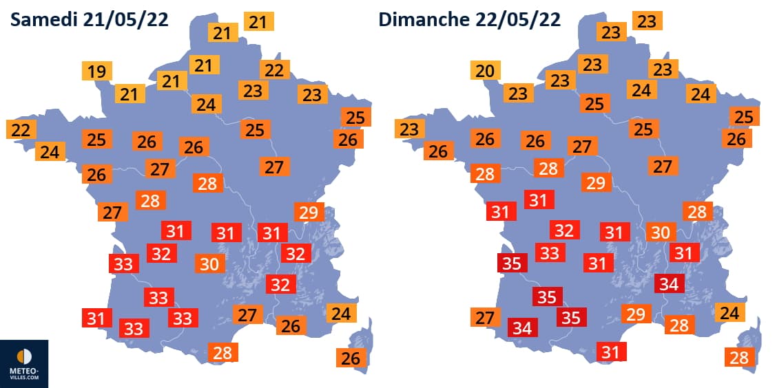 Températures maximales prévues les samedi 21 et dimanche 22 mai 2022 - Météo Villes