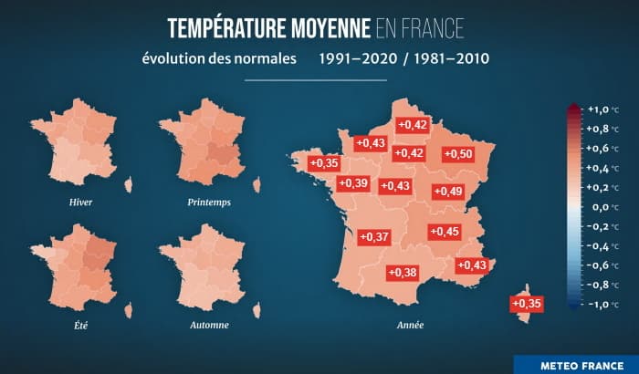 Les températures ont augmenté de 0,42°C en France entre la période 1981-2010 et 1991-2020. Il existe toutefois des disparités régionales. Avec +0,35°C, la Bretagne est la région qui s'est le moins réchauffée. À l'inverse, c'est le Grand-Est qui enregistre l'augmentation la plus élevée avec +0,50°C. Par ailleurs, le printemps et l'été sont les saisons qui se réchauffent le plus. Au printemps, sud & est de la France subissent le réchauffement le plus marqué. L'été, c'est dans l'est du pays que la hausse est la plus forte (+0,7°C à Lyon et +0,67°C à Nancy) alors qu'elle est bien plus limitée en Bretagne (+0,17°C à Brest).