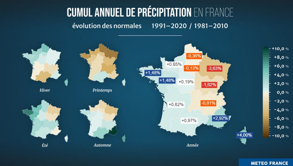 En moyenne sur l'année, il tombe autant de pluie en France sur la période 1991-2020 que sur la période 1981-2010. Cependant, il existe des disparités saisonnières et régionales. C'est le printemps qui s'assèche le plus en France, particulièrement dans le nord et l'est. L'été devient plus arrosé au nord-ouest (notamment en Bretagne) tandis que l'automne est de plus en plus humide au sud-est (particulièrement sur PACA). Sur l'année entière, le Grand-Est s'assèche le plus avec un recul considérable de 3,63% des pluies ! À l'inverse, PACA avec +2,92% et la Corse avec +4% sont les régions qui voient leur pluviométrie annuelle le plus augmenter.