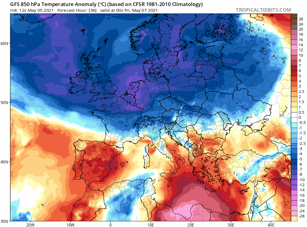 Anomalies de la masse d'air du vendredi 7 au lundi 10 mai 2021 - via tropicaltidbits.com