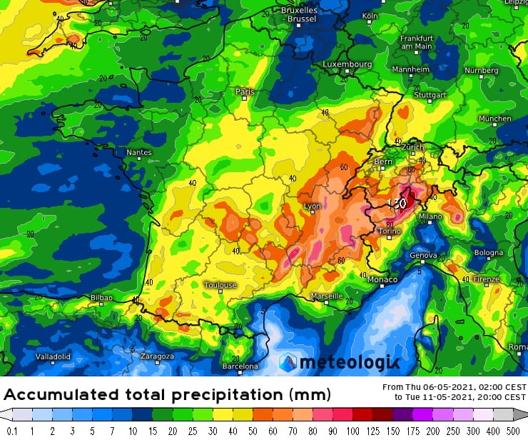 Cumuls de pluie jusqu'au mardi 11 mai 2021 selon le modèle européen - via meteologix