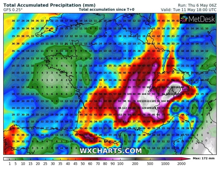 Le modèle américain s'attend à des cumuls de pluie très importants sur le sud et l'est de la France d'ici mardi 11 mai, dont le plus gros tombera le lundi 10. Les accumulations pourraient atteindre 50 à 80 mm du Massif Central aux Vosges et sur tout le flanc est avec des pointes à plus de 100 mm vers les Cévennes et les régions alpines. Le nord-ouest sera nettement moins arrosé.
