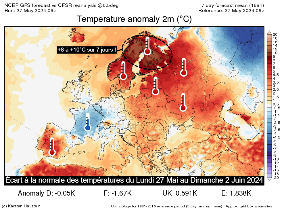 Cette anomalie est non seulement d'intensité remarquable mais elle s'inscrit également dans la durée ! Les pays scandinaves vont conserver des températures remarquablement élevées jusqu'au premier week-end du mois de juin. Sur cette période de 7 jours allant du lundi 27 mai au dimanche 2 juin 2024, l'écart à la normale sera de +8 à +10°C dans le nord de la Scandinavie, une anomalie tout bonne exceptionnelle ! Pendant ce temps - et presque ironiquement - la France sera l'un des seuls pays d'Europe à enregistrer des températures plus fraîches que la normale.