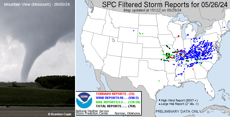 Tornade de Mountain View (Missouri) et reports de tornades (rouge), vents violents (bleu) et grêle (vert) du 26 mai 2024 - via Brandon Copic et NOAA