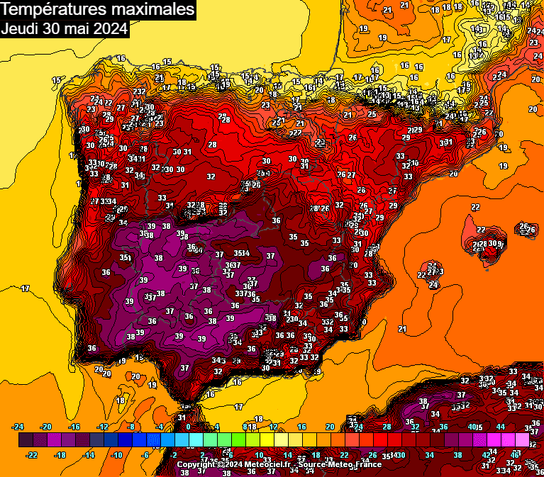 Températures maximales prévues en Espagne et au Portugal ce jeudi 30 mai 2024 - via meteociel.fr