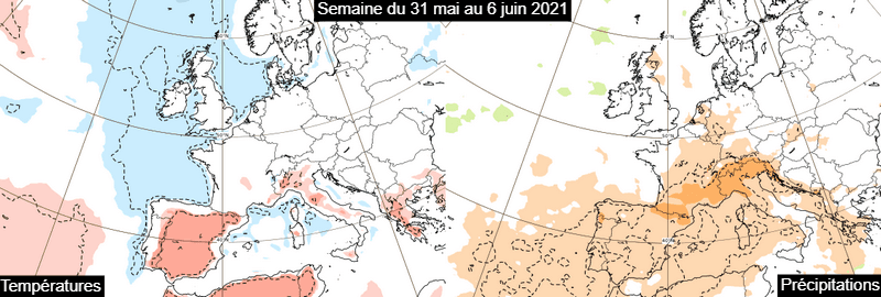 Anomalies de températures et de précipitations sur l’Ouest de l’Europe pour la semaine du 31 mai au 6 juin sur l’Ouest de l’Europe – Modèle ECMWF