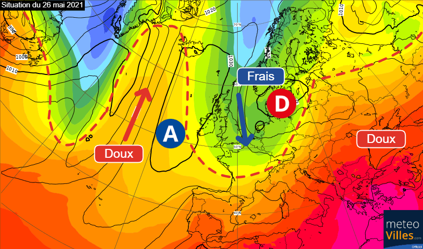Situation atmopshérique envisagée le mercredi 26 mai 2021 sur l’Ouest de l’Europe – Modèle ECMWF, modifié par Météo-Villes