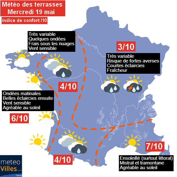 Ce mercredi 19 mai marque le retour de la possibilité de profiter des terrasses des cafés, bars et restaurants en France. Néanmoins la météo reste capricieuse depuis plusieurs jours et l’influence océanique perturbée semble bien ancrée sur le pays. Encore présente en ce début de semaine, celle-ci persiste dans les prochains jours et devrait toujours être d’actualité ce mercredi 19 mai 2021.