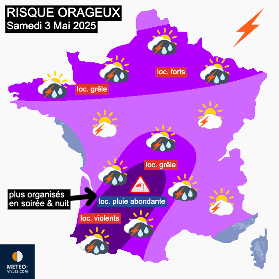 Carte du risque orageux pour le samedi 3 mai 2025 - Météo Villes