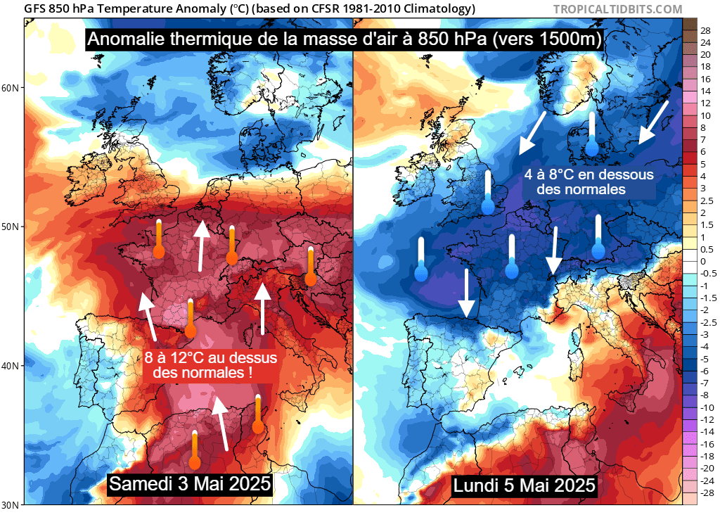 Il faut dire que tous les ingrédients d'une dégradation orageuse importante seront réunis, pour la première fois en cette année 2025. La France va vivre un changement de masses d'air spectaculaire. Samedi 3 mai 2025, les températures en altitude (vers 1500m) seront situées 8 à 12°C au dessus des moyennes de saison. Deux jours plus tard, le lundi 5 mai, elles plongeront 4 à 8°C en dessous des moyennes sur une large moitié nord ! Dans le nord de l'hexagone, la masse d'air perdra 15°C en moins de deux jours !