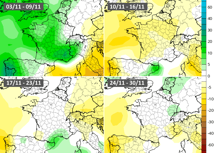 Le modèle américain propose un scénario similaire, mais plus tranché. Comme son homologue européen, il mise sur une semaine du 3 au 9 novembre 2025 globalement humide sur une grande partie de la France. En revanche, la tendance s'inverserait dès la semaine du 10 au 16 novembre avec un retour des hautes pressions et un temps souvent sec. Ensuite, la deuxième partie de novembre serait globalement plus sèche que la normale, bien que le modèle entrevoit une anomalie humide vers le golfe du Lion en semaine du 17 au 23 novembre.