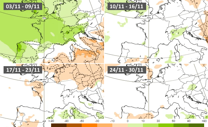 Anomalies pluviométriques hebdomadaires en novembre 2025 - modèle européen via ECMWF