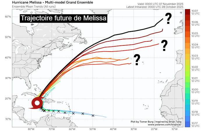 Trajectoires possibles de l'ouragan puis ex-ouragan Melissa - polarwx.com